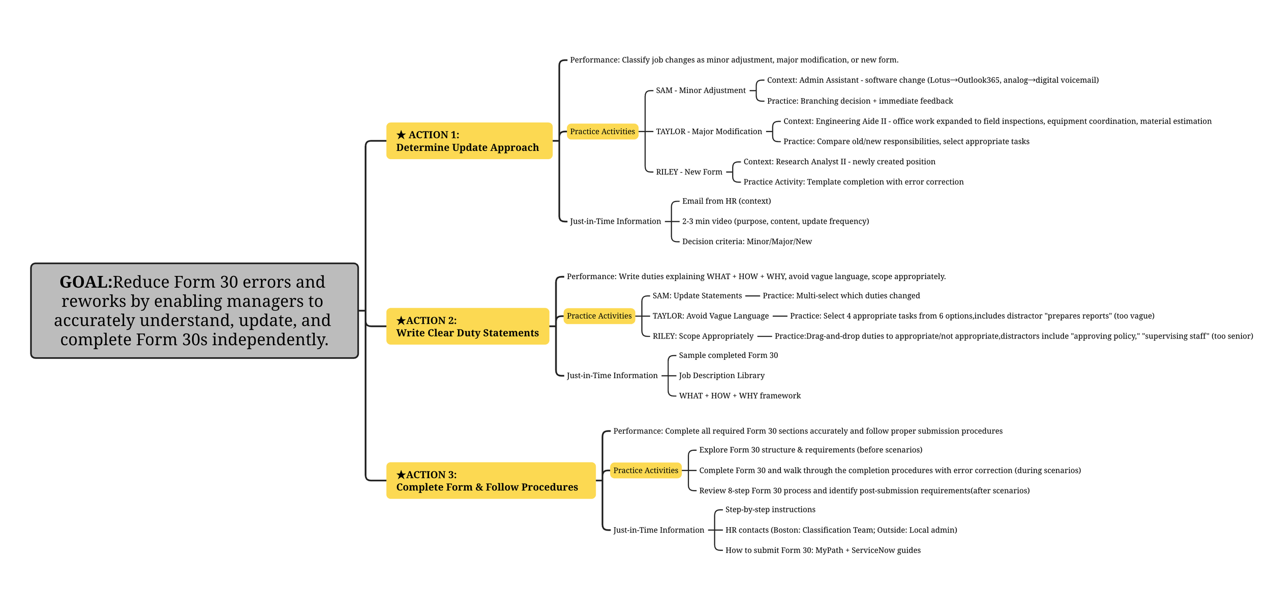 Using action mapping, inspired by Cathy Moore, I translated the business goal into three critical manager actions that directly impact Form 30 accuracy and compliance.