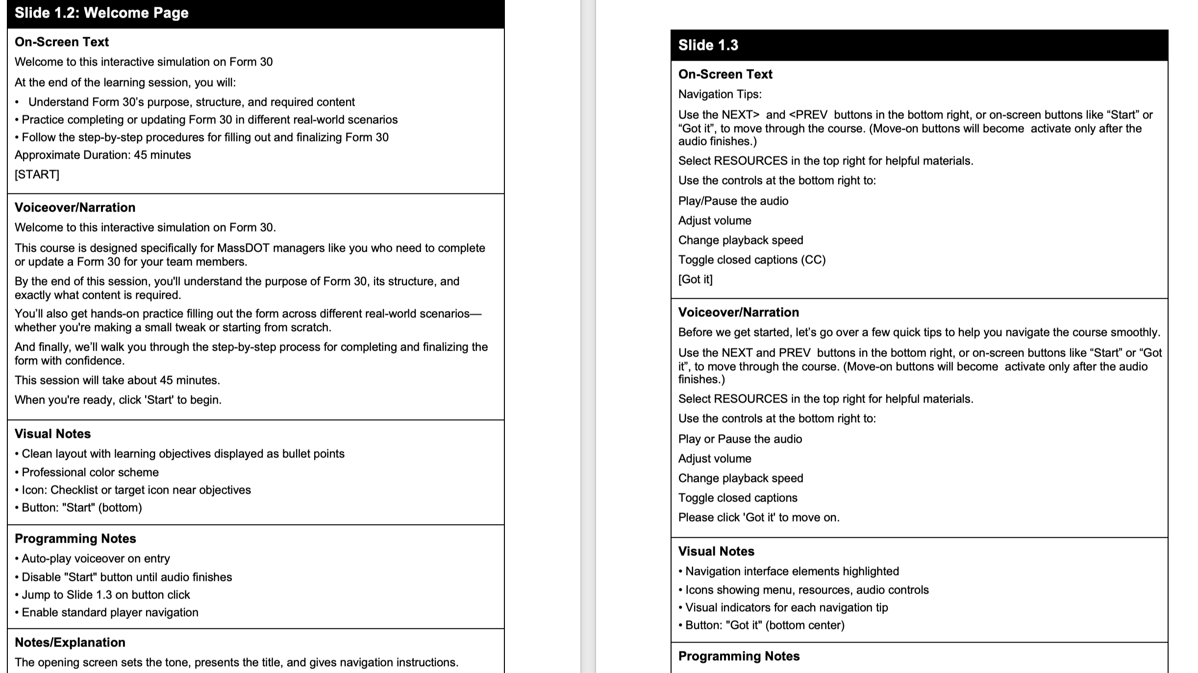 This storyboard documents a 45-minute scenario-based eLearning course designed to train MassDOT managers on Form 30 completion.