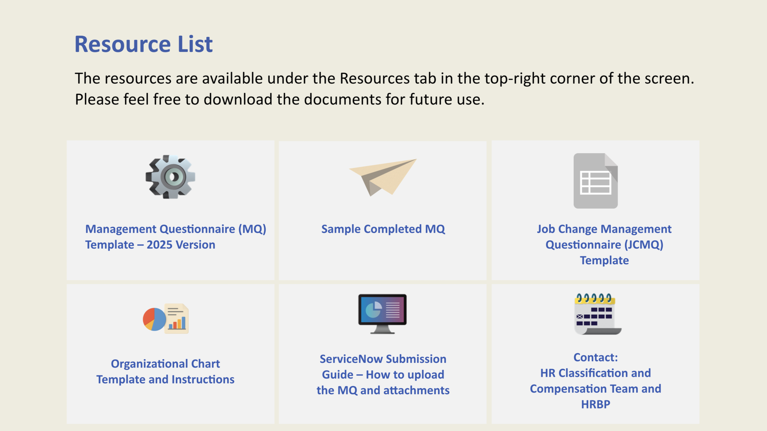 Based on SME feedback, we prepared and uploaded job aids under the Resources tab. These included not only the MQ template, MQ sample, and JCMQ sample, but also an organizational chart sample, classification instructions, and guidance on how to submit documents.