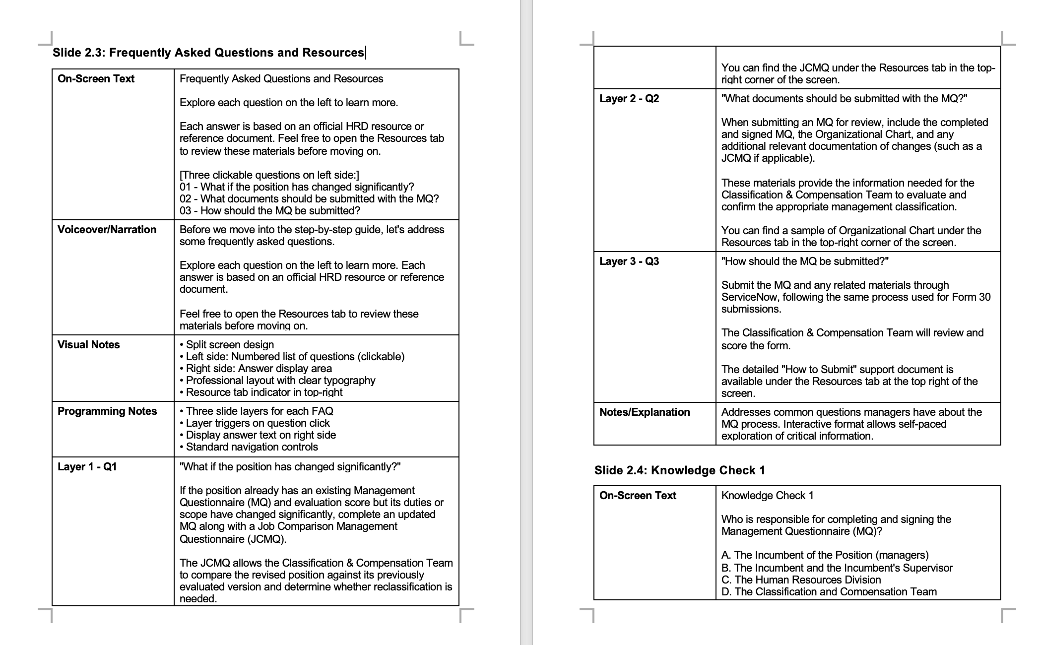 This storyboard documents a 45-minute scenario-based eLearning course designed to train MassDOT managers on completing the Management Questionnaire (MQ) form. Initial content testing revealed that the official introduction felt overly formal and difficult to follow. To address this, I translated the policy language into a clearer, more accessible version while maintaining accuracy.