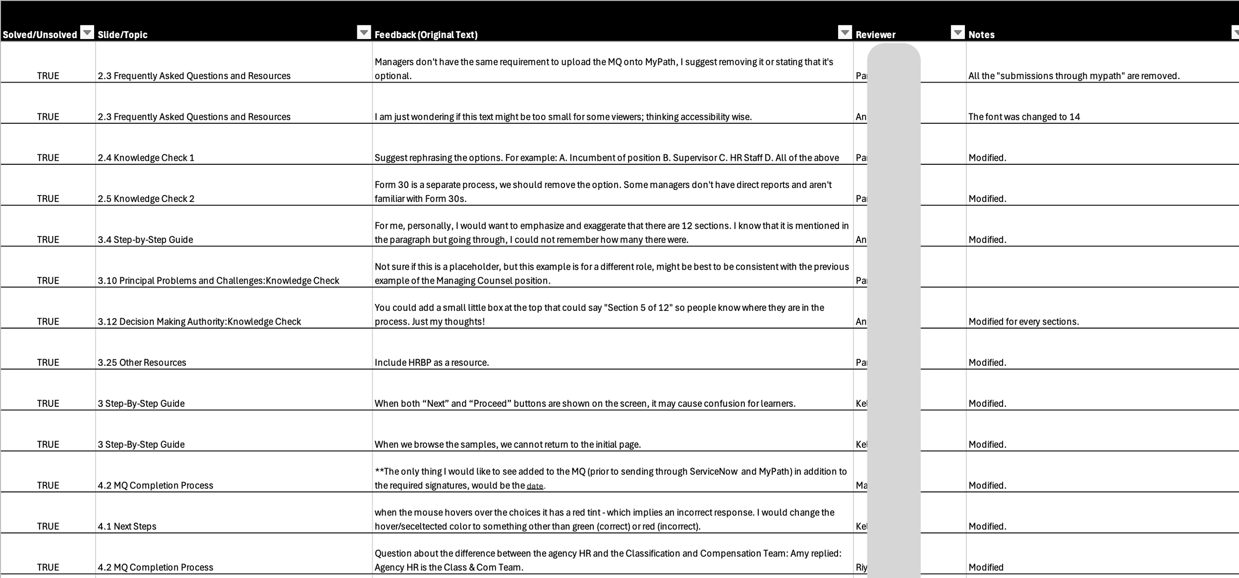 Feedback was collected at each stage through review meetings, shared documentation, and prototype testing. All suggestions were logged systematically and categorized by content accuracy, learning experience design, and accessibility requirements.