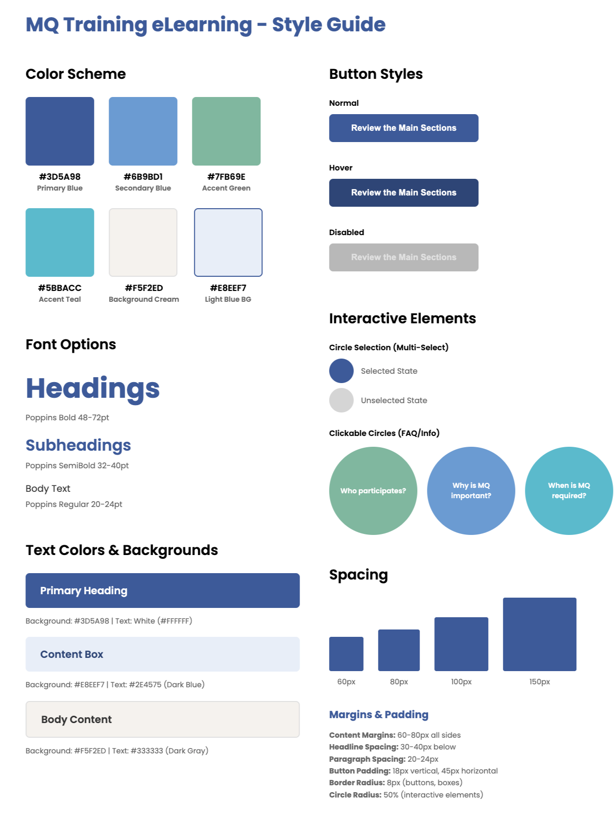 Finally, I recognized the importance of emotional support in compliance training. Because the MQ can feel intimidating, I intentionally used supportive language, clear chunking of content, visual hierarchy, and visible section numbering to orient learners throughout the experience. Providing clarity about where they are and what comes next helped reduce cognitive and emotional strain.