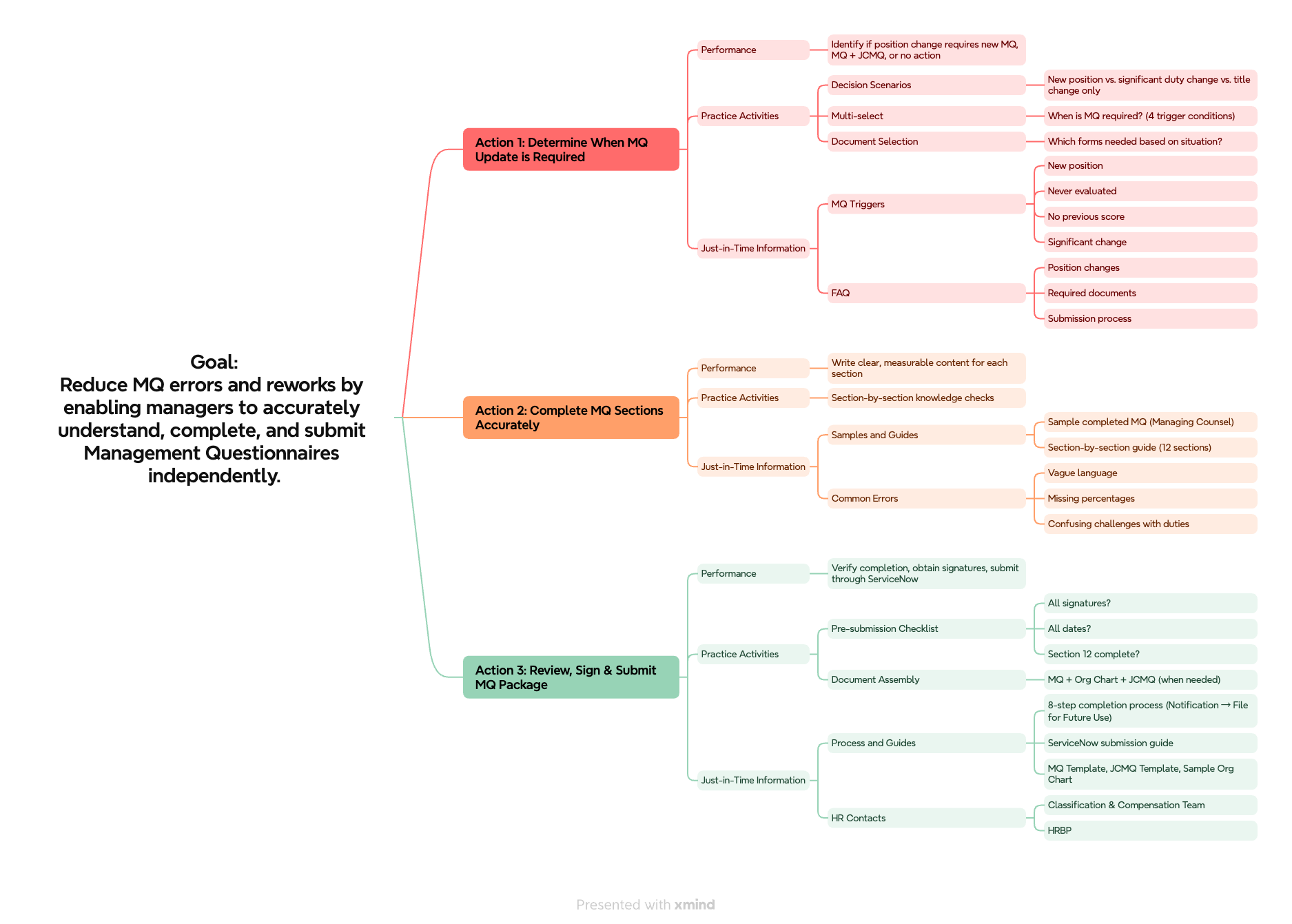 We partnered with HR and the Classification & Compensation team to define a clear learning goal grounded in official guidelines, policy requirements, and SME input, with a focus on reducing MQ errors and rework.